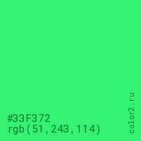 Цвет #33F372 в цветовой модели RGB обозначается тремя октетами (51, 243, 114) в десятичном формате и #33F372 в шестнадцатиричном (hex) формате, которые являются интенсивностью красного 51 (hex 33), интенсивность зелёного 243 (hex F3) и интенсивность синего 114 (hex 72).