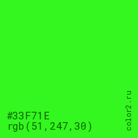 Цвет #33F71E в цветовой модели RGB обозначается тремя октетами (51, 247, 30) в десятичном формате и #33F71E в шестнадцатиричном (hex) формате, которые являются интенсивностью красного 51 (hex 33), интенсивность зелёного 247 (hex F7) и интенсивность синего 30 (hex 1E).