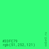 Цвет #33FC79 в цветовой модели RGB обозначается тремя октетами (51, 252, 121) в десятичном формате и #33FC79 в шестнадцатиричном (hex) формате, которые являются интенсивностью красного 51 (hex 33), интенсивность зелёного 252 (hex FC) и интенсивность синего 121 (hex 79).