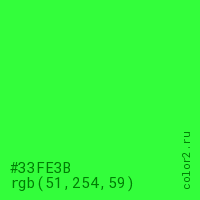 Цвет #33FE3B в цветовой модели RGB обозначается тремя октетами (51, 254, 59) в десятичном формате и #33FE3B в шестнадцатиричном (hex) формате, которые являются интенсивностью красного 51 (hex 33), интенсивность зелёного 254 (hex FE) и интенсивность синего 59 (hex 3B).