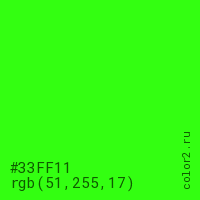 Цвет #33FF11 в цветовой модели RGB обозначается тремя октетами (51, 255, 17) в десятичном формате и #33FF11 в шестнадцатиричном (hex) формате, которые являются интенсивностью красного 51 (hex 33), интенсивность зелёного 255 (hex FF) и интенсивность синего 17 (hex 11).
