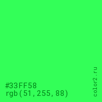 Цвет #33FF58 в цветовой модели RGB обозначается тремя октетами (51, 255, 88) в десятичном формате и #33FF58 в шестнадцатиричном (hex) формате, которые являются интенсивностью красного 51 (hex 33), интенсивность зелёного 255 (hex FF) и интенсивность синего 88 (hex 58).