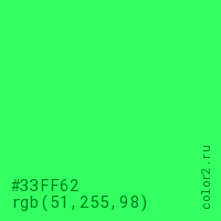 Цвет #33FF62 в цветовой модели RGB обозначается тремя октетами (51, 255, 98) в десятичном формате и #33FF62 в шестнадцатиричном (hex) формате, которые являются интенсивностью красного 51 (hex 33), интенсивность зелёного 255 (hex FF) и интенсивность синего 98 (hex 62).
