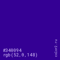 Цвет #340094 в цветовой модели RGB обозначается тремя октетами (52, 0, 148) в десятичном формате и #340094 в шестнадцатиричном (hex) формате, которые являются интенсивностью красного 52 (hex 34), интенсивность зелёного 0 (hex 00) и интенсивность синего 148 (hex 94).