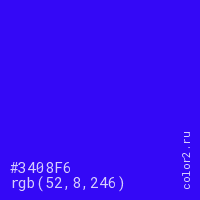 Цвет #3408F6 в цветовой модели RGB обозначается тремя октетами (52, 8, 246) в десятичном формате и #3408F6 в шестнадцатиричном (hex) формате, которые являются интенсивностью красного 52 (hex 34), интенсивность зелёного 8 (hex 08) и интенсивность синего 246 (hex F6).