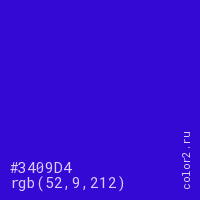 Цвет #3409D4 в цветовой модели RGB обозначается тремя октетами (52, 9, 212) в десятичном формате и #3409D4 в шестнадцатиричном (hex) формате, которые являются интенсивностью красного 52 (hex 34), интенсивность зелёного 9 (hex 09) и интенсивность синего 212 (hex D4).