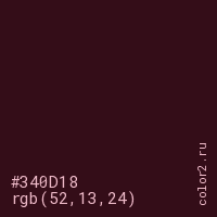 Цвет #340D18 в цветовой модели RGB обозначается тремя октетами (52, 13, 24) в десятичном формате и #340D18 в шестнадцатиричном (hex) формате, которые являются интенсивностью красного 52 (hex 34), интенсивность зелёного 13 (hex 0D) и интенсивность синего 24 (hex 18).