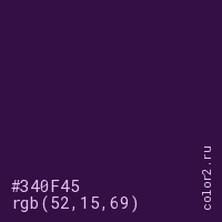 Цвет #340F45 в цветовой модели RGB обозначается тремя октетами (52, 15, 69) в десятичном формате и #340F45 в шестнадцатиричном (hex) формате, которые являются интенсивностью красного 52 (hex 34), интенсивность зелёного 15 (hex 0F) и интенсивность синего 69 (hex 45).