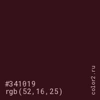 Цвет #341019 в цветовой модели RGB обозначается тремя октетами (52, 16, 25) в десятичном формате и #341019 в шестнадцатиричном (hex) формате, которые являются интенсивностью красного 52 (hex 34), интенсивность зелёного 16 (hex 10) и интенсивность синего 25 (hex 19).