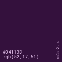 Цвет #34113D в цветовой модели RGB обозначается тремя октетами (52, 17, 61) в десятичном формате и #34113D в шестнадцатиричном (hex) формате, которые являются интенсивностью красного 52 (hex 34), интенсивность зелёного 17 (hex 11) и интенсивность синего 61 (hex 3D).