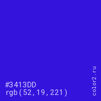 Цвет #3413DD в цветовой модели RGB обозначается тремя октетами (52, 19, 221) в десятичном формате и #3413DD в шестнадцатиричном (hex) формате, которые являются интенсивностью красного 52 (hex 34), интенсивность зелёного 19 (hex 13) и интенсивность синего 221 (hex DD).