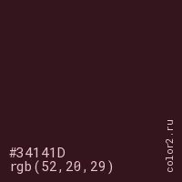 Цвет #34141D в цветовой модели RGB обозначается тремя октетами (52, 20, 29) в десятичном формате и #34141D в шестнадцатиричном (hex) формате, которые являются интенсивностью красного 52 (hex 34), интенсивность зелёного 20 (hex 14) и интенсивность синего 29 (hex 1D).