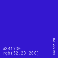 Цвет #3417D0 в цветовой модели RGB обозначается тремя октетами (52, 23, 208) в десятичном формате и #3417D0 в шестнадцатиричном (hex) формате, которые являются интенсивностью красного 52 (hex 34), интенсивность зелёного 23 (hex 17) и интенсивность синего 208 (hex D0).