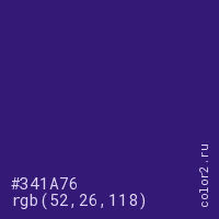 Цвет #341A76 в цветовой модели RGB обозначается тремя октетами (52, 26, 118) в десятичном формате и #341A76 в шестнадцатиричном (hex) формате, которые являются интенсивностью красного 52 (hex 34), интенсивность зелёного 26 (hex 1A) и интенсивность синего 118 (hex 76).