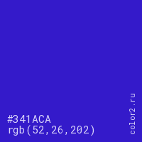 Цвет #341ACA в цветовой модели RGB обозначается тремя октетами (52, 26, 202) в десятичном формате и #341ACA в шестнадцатиричном (hex) формате, которые являются интенсивностью красного 52 (hex 34), интенсивность зелёного 26 (hex 1A) и интенсивность синего 202 (hex CA).