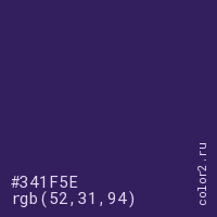 Цвет #341F5E в цветовой модели RGB обозначается тремя октетами (52, 31, 94) в десятичном формате и #341F5E в шестнадцатиричном (hex) формате, которые являются интенсивностью красного 52 (hex 34), интенсивность зелёного 31 (hex 1F) и интенсивность синего 94 (hex 5E).