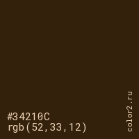 Цвет #34210C в цветовой модели RGB обозначается тремя октетами (52, 33, 12) в десятичном формате и #34210C в шестнадцатиричном (hex) формате, которые являются интенсивностью красного 52 (hex 34), интенсивность зелёного 33 (hex 21) и интенсивность синего 12 (hex 0C).