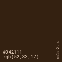 Цвет #342111 в цветовой модели RGB обозначается тремя октетами (52, 33, 17) в десятичном формате и #342111 в шестнадцатиричном (hex) формате, которые являются интенсивностью красного 52 (hex 34), интенсивность зелёного 33 (hex 21) и интенсивность синего 17 (hex 11).