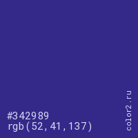Цвет #342989 в цветовой модели RGB обозначается тремя октетами (52, 41, 137) в десятичном формате и #342989 в шестнадцатиричном (hex) формате, которые являются интенсивностью красного 52 (hex 34), интенсивность зелёного 41 (hex 29) и интенсивность синего 137 (hex 89).