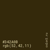 Цвет #342A0B в цветовой модели RGB обозначается тремя октетами (52, 42, 11) в десятичном формате и #342A0B в шестнадцатиричном (hex) формате, которые являются интенсивностью красного 52 (hex 34), интенсивность зелёного 42 (hex 2A) и интенсивность синего 11 (hex 0B).