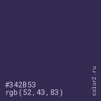 Цвет #342B53 в цветовой модели RGB обозначается тремя октетами (52, 43, 83) в десятичном формате и #342B53 в шестнадцатиричном (hex) формате, которые являются интенсивностью красного 52 (hex 34), интенсивность зелёного 43 (hex 2B) и интенсивность синего 83 (hex 53).