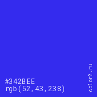 Цвет #342BEE в цветовой модели RGB обозначается тремя октетами (52, 43, 238) в десятичном формате и #342BEE в шестнадцатиричном (hex) формате, которые являются интенсивностью красного 52 (hex 34), интенсивность зелёного 43 (hex 2B) и интенсивность синего 238 (hex EE).