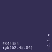 Цвет #342D54 в цветовой модели RGB обозначается тремя октетами (52, 45, 84) в десятичном формате и #342D54 в шестнадцатиричном (hex) формате, которые являются интенсивностью красного 52 (hex 34), интенсивность зелёного 45 (hex 2D) и интенсивность синего 84 (hex 54).