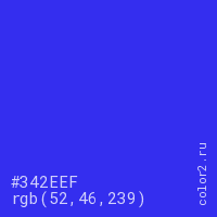 Цвет #342EEF в цветовой модели RGB обозначается тремя октетами (52, 46, 239) в десятичном формате и #342EEF в шестнадцатиричном (hex) формате, которые являются интенсивностью красного 52 (hex 34), интенсивность зелёного 46 (hex 2E) и интенсивность синего 239 (hex EF).
