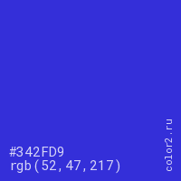 Цвет #342FD9 в цветовой модели RGB обозначается тремя октетами (52, 47, 217) в десятичном формате и #342FD9 в шестнадцатиричном (hex) формате, которые являются интенсивностью красного 52 (hex 34), интенсивность зелёного 47 (hex 2F) и интенсивность синего 217 (hex D9).