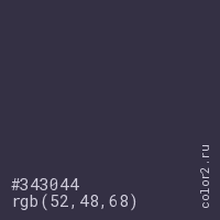 Цвет #343044 в цветовой модели RGB обозначается тремя октетами (52, 48, 68) в десятичном формате и #343044 в шестнадцатиричном (hex) формате, которые являются интенсивностью красного 52 (hex 34), интенсивность зелёного 48 (hex 30) и интенсивность синего 68 (hex 44).