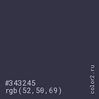 Цвет #343245 в цветовой модели RGB обозначается тремя октетами (52, 50, 69) в десятичном формате и #343245 в шестнадцатиричном (hex) формате, которые являются интенсивностью красного 52 (hex 34), интенсивность зелёного 50 (hex 32) и интенсивность синего 69 (hex 45).
