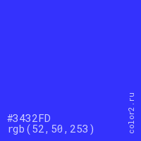 Цвет #3432FD в цветовой модели RGB обозначается тремя октетами (52, 50, 253) в десятичном формате и #3432FD в шестнадцатиричном (hex) формате, которые являются интенсивностью красного 52 (hex 34), интенсивность зелёного 50 (hex 32) и интенсивность синего 253 (hex FD).