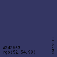 Цвет #343663 в цветовой модели RGB обозначается тремя октетами (52, 54, 99) в десятичном формате и #343663 в шестнадцатиричном (hex) формате, которые являются интенсивностью красного 52 (hex 34), интенсивность зелёного 54 (hex 36) и интенсивность синего 99 (hex 63).