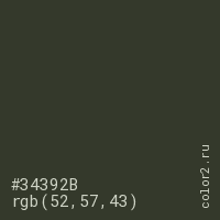 Цвет #34392B в цветовой модели RGB обозначается тремя октетами (52, 57, 43) в десятичном формате и #34392B в шестнадцатиричном (hex) формате, которые являются интенсивностью красного 52 (hex 34), интенсивность зелёного 57 (hex 39) и интенсивность синего 43 (hex 2B).