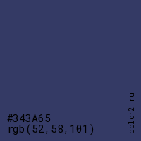 Цвет #343A65 в цветовой модели RGB обозначается тремя октетами (52, 58, 101) в десятичном формате и #343A65 в шестнадцатиричном (hex) формате, которые являются интенсивностью красного 52 (hex 34), интенсивность зелёного 58 (hex 3A) и интенсивность синего 101 (hex 65).