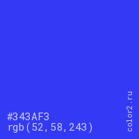 Цвет #343AF3 в цветовой модели RGB обозначается тремя октетами (52, 58, 243) в десятичном формате и #343AF3 в шестнадцатиричном (hex) формате, которые являются интенсивностью красного 52 (hex 34), интенсивность зелёного 58 (hex 3A) и интенсивность синего 243 (hex F3).