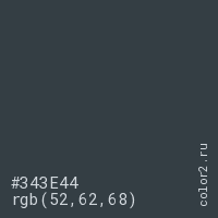 Цвет #343E44 в цветовой модели RGB обозначается тремя октетами (52, 62, 68) в десятичном формате и #343E44 в шестнадцатиричном (hex) формате, которые являются интенсивностью красного 52 (hex 34), интенсивность зелёного 62 (hex 3E) и интенсивность синего 68 (hex 44).