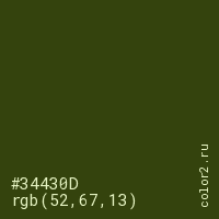 Цвет #34430D в цветовой модели RGB обозначается тремя октетами (52, 67, 13) в десятичном формате и #34430D в шестнадцатиричном (hex) формате, которые являются интенсивностью красного 52 (hex 34), интенсивность зелёного 67 (hex 43) и интенсивность синего 13 (hex 0D).