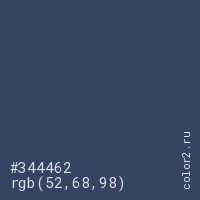 Цвет #344462 в цветовой модели RGB обозначается тремя октетами (52, 68, 98) в десятичном формате и #344462 в шестнадцатиричном (hex) формате, которые являются интенсивностью красного 52 (hex 34), интенсивность зелёного 68 (hex 44) и интенсивность синего 98 (hex 62).