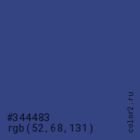 Цвет #344483 в цветовой модели RGB обозначается тремя октетами (52, 68, 131) в десятичном формате и #344483 в шестнадцатиричном (hex) формате, которые являются интенсивностью красного 52 (hex 34), интенсивность зелёного 68 (hex 44) и интенсивность синего 131 (hex 83).