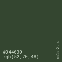Цвет #344630 в цветовой модели RGB обозначается тремя октетами (52, 70, 48) в десятичном формате и #344630 в шестнадцатиричном (hex) формате, которые являются интенсивностью красного 52 (hex 34), интенсивность зелёного 70 (hex 46) и интенсивность синего 48 (hex 30).