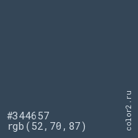 Цвет #344657 в цветовой модели RGB обозначается тремя октетами (52, 70, 87) в десятичном формате и #344657 в шестнадцатиричном (hex) формате, которые являются интенсивностью красного 52 (hex 34), интенсивность зелёного 70 (hex 46) и интенсивность синего 87 (hex 57).