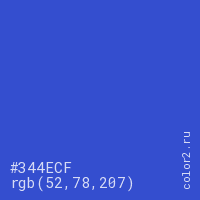 Цвет #344ECF в цветовой модели RGB обозначается тремя октетами (52, 78, 207) в десятичном формате и #344ECF в шестнадцатиричном (hex) формате, которые являются интенсивностью красного 52 (hex 34), интенсивность зелёного 78 (hex 4E) и интенсивность синего 207 (hex CF).