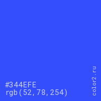 Цвет #344EFE в цветовой модели RGB обозначается тремя октетами (52, 78, 254) в десятичном формате и #344EFE в шестнадцатиричном (hex) формате, которые являются интенсивностью красного 52 (hex 34), интенсивность зелёного 78 (hex 4E) и интенсивность синего 254 (hex FE).