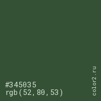 Цвет #345035 в цветовой модели RGB обозначается тремя октетами (52, 80, 53) в десятичном формате и #345035 в шестнадцатиричном (hex) формате, которые являются интенсивностью красного 52 (hex 34), интенсивность зелёного 80 (hex 50) и интенсивность синего 53 (hex 35).