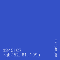 Цвет #3451C7 в цветовой модели RGB обозначается тремя октетами (52, 81, 199) в десятичном формате и #3451C7 в шестнадцатиричном (hex) формате, которые являются интенсивностью красного 52 (hex 34), интенсивность зелёного 81 (hex 51) и интенсивность синего 199 (hex C7).