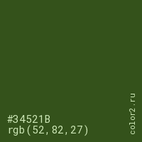Цвет #34521B в цветовой модели RGB обозначается тремя октетами (52, 82, 27) в десятичном формате и #34521B в шестнадцатиричном (hex) формате, которые являются интенсивностью красного 52 (hex 34), интенсивность зелёного 82 (hex 52) и интенсивность синего 27 (hex 1B).