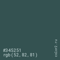 Цвет #345251 в цветовой модели RGB обозначается тремя октетами (52, 82, 81) в десятичном формате и #345251 в шестнадцатиричном (hex) формате, которые являются интенсивностью красного 52 (hex 34), интенсивность зелёного 82 (hex 52) и интенсивность синего 81 (hex 51).