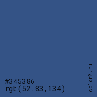 Цвет #345386 в цветовой модели RGB обозначается тремя октетами (52, 83, 134) в десятичном формате и #345386 в шестнадцатиричном (hex) формате, которые являются интенсивностью красного 52 (hex 34), интенсивность зелёного 83 (hex 53) и интенсивность синего 134 (hex 86).