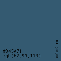 Цвет #345A71 в цветовой модели RGB обозначается тремя октетами (52, 90, 113) в десятичном формате и #345A71 в шестнадцатиричном (hex) формате, которые являются интенсивностью красного 52 (hex 34), интенсивность зелёного 90 (hex 5A) и интенсивность синего 113 (hex 71).